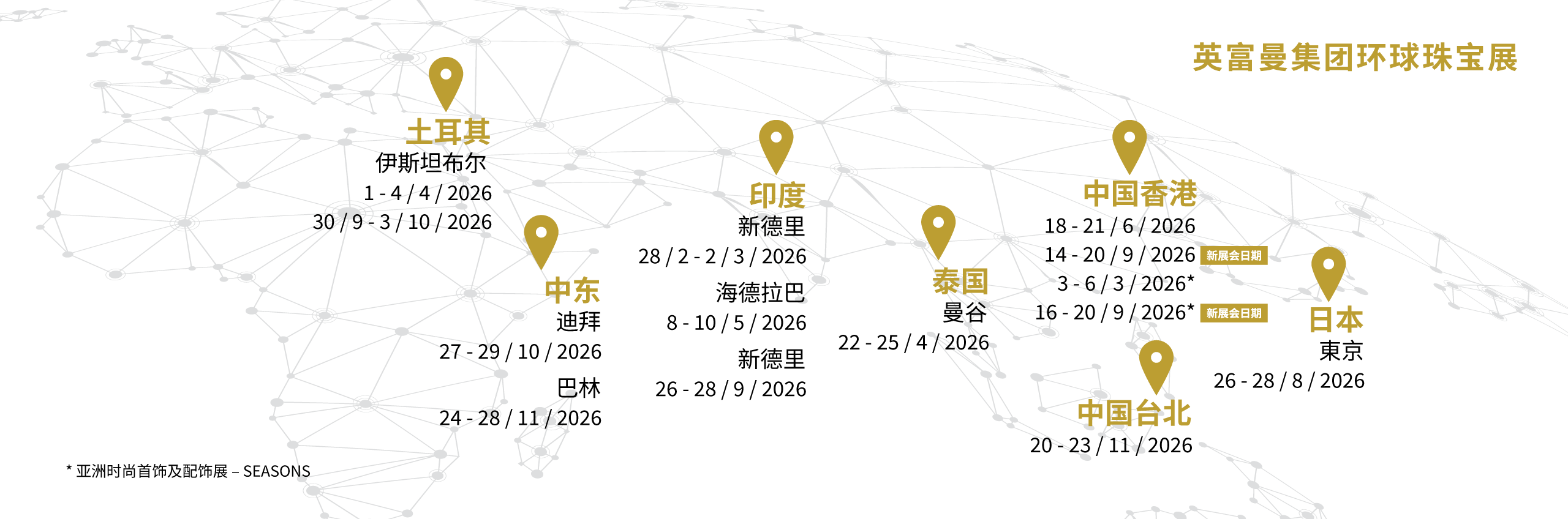 在环球珠宝展览业务方面,每年大型的展览盛会共有14场,版图遍及9个重点城市;而在业界平台方面,我们拥有网路效能贯穿全球的JewelleryNet、专业的珠宝媒体,以及业内最具认受性、最卓越的颁奖典礼Jewellery World Awards等。以上种种,丰富了我们在业界的资源和经验,加强了我们对行业的影响,在业务发展上更聚焦。