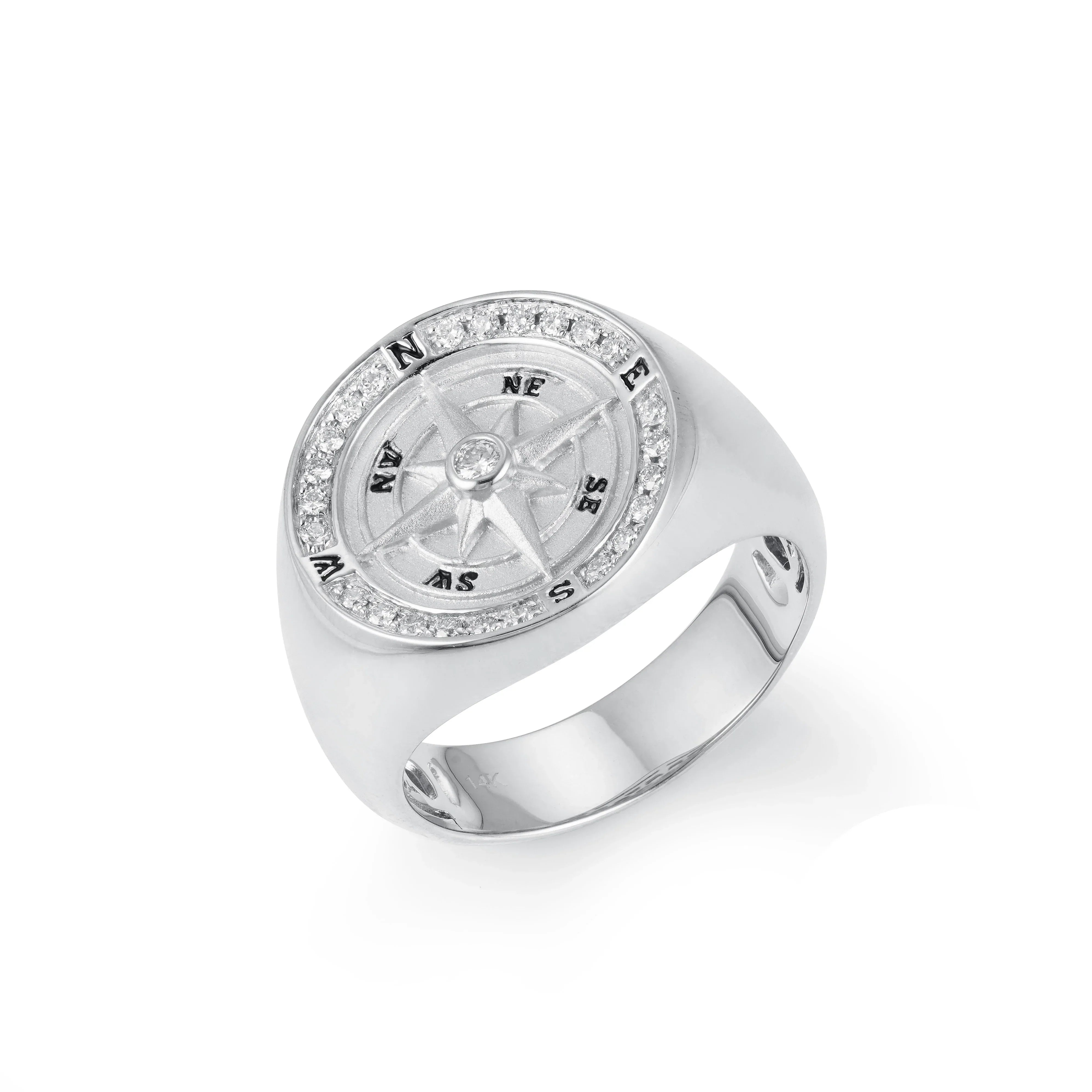 Elevate your style with our Navigator Diamond Signet Ring, crafted with precision and set with stunning natural diamonds. The compass symbol is a timeless reminder to follow your true north to achieve your dreams. From formal occasions to everyday wear, this sleek and modern ring adds sophistication to any outfit. Showcase your unique sense of style with our exquisite Navigator Diamond Signet Ring.