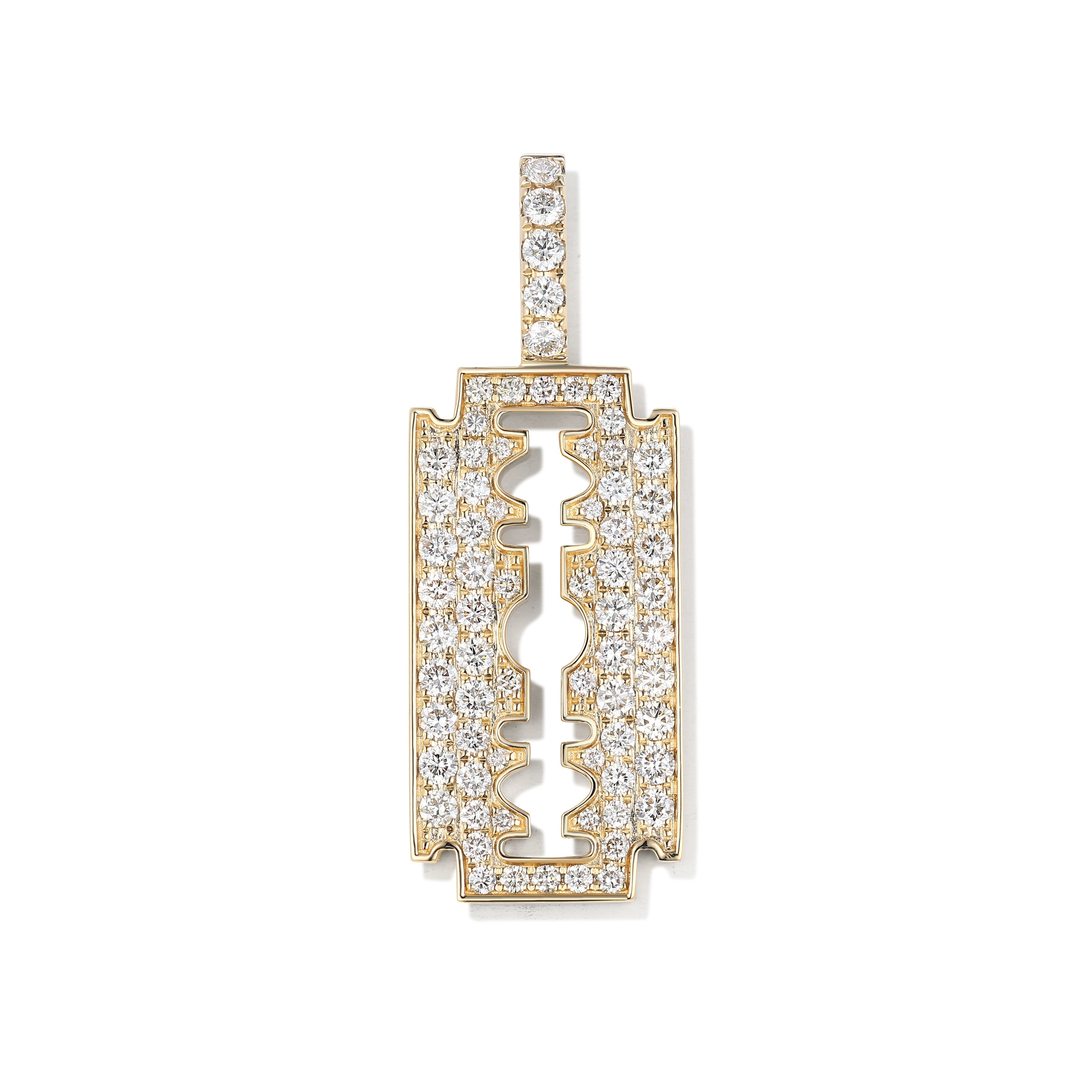 Experience the razor sharp elegance of our diamond pendant is a bold and edgy statement piece that will turn heads wherever you go. The razor blade shape is made of solid 14k gold and is encrusted with sparkling diamonds, creating a stunning contrast of sharp edges and soft brilliance. This pendant is perfect for the jewelry enthusiast who wants something unique and eye-catching.